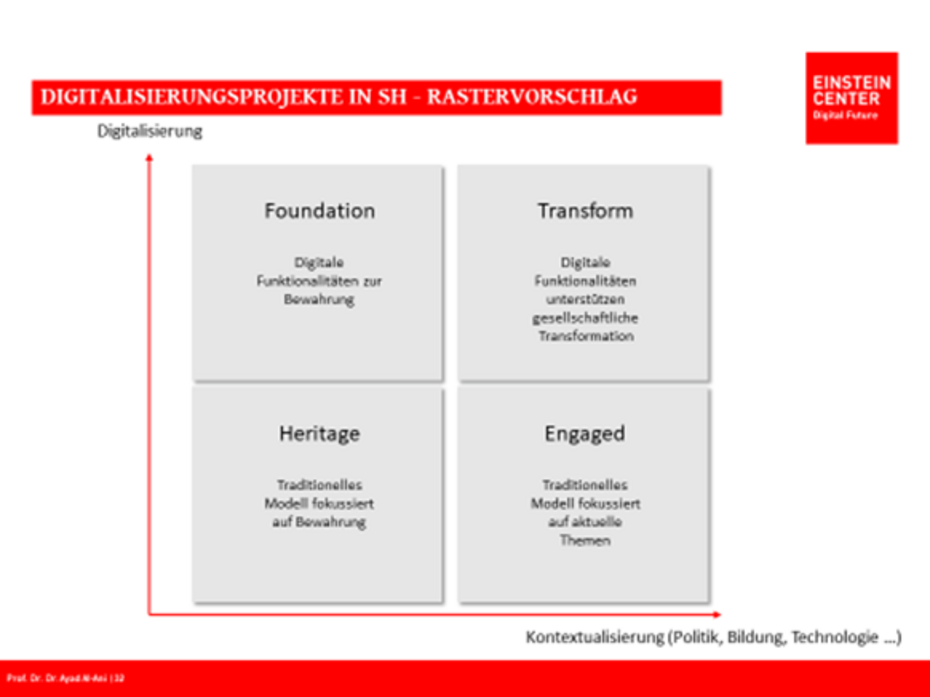 Die skizzierten technologischen und organisatorischen Lösungen lassen sich in Bezug auf mögliche strategische Rollenbilder bzw. Schwerpunkte von Kultureinrichtungen in der digitalen Gesellschaft zusammenfassen (s. Abb. 4), nämlich Foundations für die digitale Bewahrung, Transformatoren für die Entwicklung der Gesellschaft, Heritage für die Vermittlung des Kulturerbes und Engagement, das sich mit aktuellen Themen auseinandersetzt.