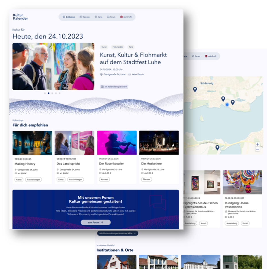 Dazu kann eine Benutzendenseite erstellt werden, die Inhalte verschiedener Kultureinrichtungen des Landes kategorisiert darstellt (Veranstaltungskalender) bzw. auf Basis der Präferenzen der Nutzenden vorschlägt (s. Abb. 5).